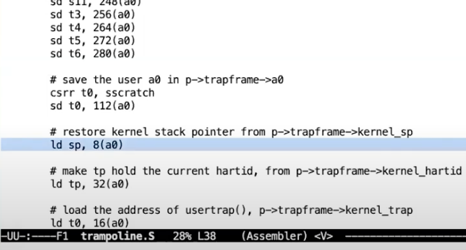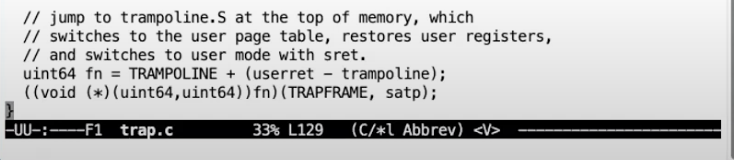 这是内核返回到用户空间的最后的C函数。C函数做的最后一件事情是调用fn函数,传递的参数是TRAMFRAME和user page table。在C代码中,当你调用函数,第一个参数会存在a0,这就是为什么a0里面的数值是指向trapframe的指针。fn函数是就是刚刚我向你展示的位于trampoline.S中的代码。