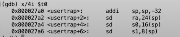 可以看到t0的位置对应于一个叫做usertrap函数的开始。接下来我们就要以kernel stack,kernel page table跳转到usertrap函数。