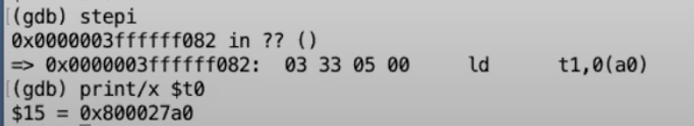 最后一条指令是_jr t0_。执行了这条指令,我们就要从trampoline跳到内核的C代码中。这条指令的作用是跳转到t0指向的函数中。我们打印t0对应的一些指令,