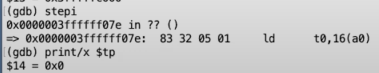 下一条指令是向tp寄存器写入数据。因为在RISC-V中,没有一个直接的方法来确认当前运行在多核处理器的哪个核上,XV6会将CPU核的编号也就是hartid保存在tp寄存器。在内核中好几个地方都会使用了这个值,例如,内核可以通过这个值确定某个CPU核上运行了哪些进程。我们执行这条指令,并且打印tp寄存器。