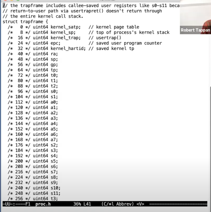 如果你想查看XV6在trapframe page中存放了什么,这部分代码在proc.h中的trapframe结构体中。