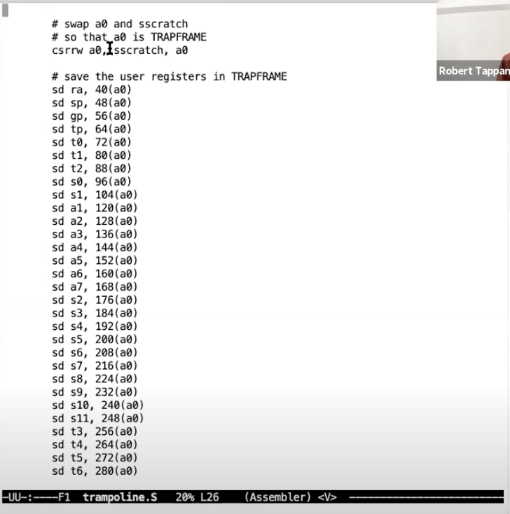 Robert教授:在内核前一次切换回用户空间时,内核会执行set sscratch指令,将这个寄存器的内容设置为0x3fffffe000,也就是trapframe page的虚拟地址。所以,当我们在运行用户代码,比如运行Shell时,SSCRATCH保存的就是指向trapframe的地址。之后,Shell执行了ecall指令,跳转到了trampoline page,这个page中的第一条指令会交换a0和SSCRATCH寄存器的内容。所以,SSCRATCH中的值,也就是指向trapframe的指针现在存储与a0寄存器中。