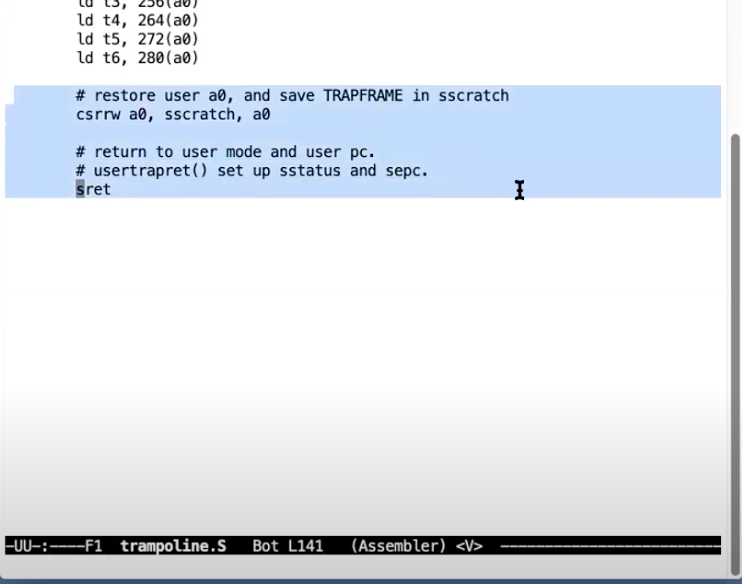 选中的代码是内核在返回到用户空间之前执行的最后两条指令。在内核返回到用户空间时,会恢复所有的用户寄存器。之后会再次执行交换指令,csrrw。因为之前内核已经设置了a0保存的是trap frame地址,经过交换之后SSCRATCH仍然指向了trapframe page地址,而a0也恢复成了之前的数值。最后sret返回到了用户空间。