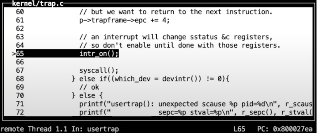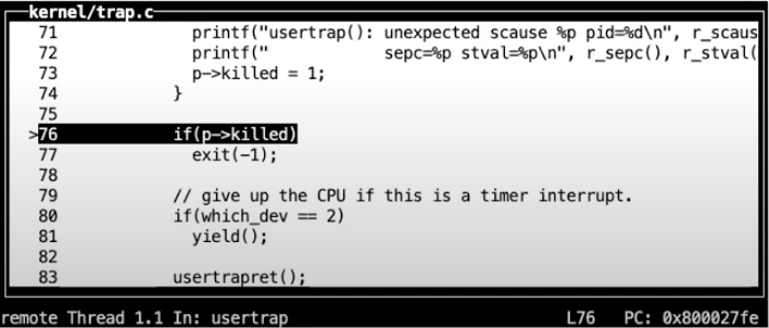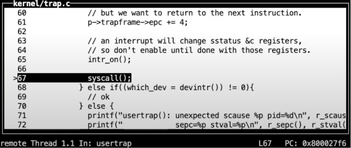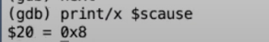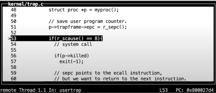 接下来我们需要找出我们现在会在usertrap函数的原因。根据触发trap的原因,RISC-V的SCAUSE寄存器会有不同的数字。数字8表明,我们现在在trap代码中是因为系统调用。可以打印SCAUSE寄存器,它的确包含了数字8,我们的确是因为系统调用才走到这里的。