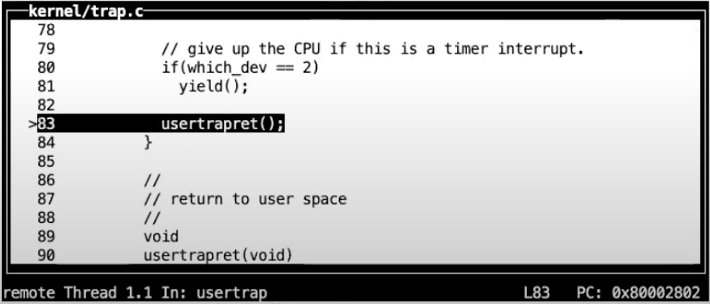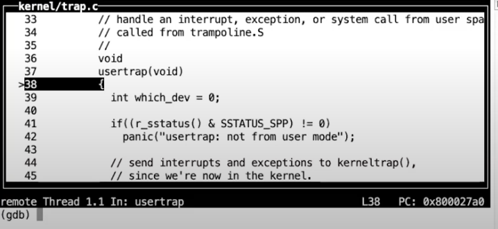 有很多原因都可以让程序运行进入到usertrap函数中来,比如系统调用,运算时除以0,使用了一个未被映射的虚拟地址,或者是设备中断。usertrap某种程度上存储并恢复硬件状态,但是它也需要检查触发trap的原因,以确定相应的处理方式,我们在接下来执行usertrap的过程中会同时看到这两个行为。