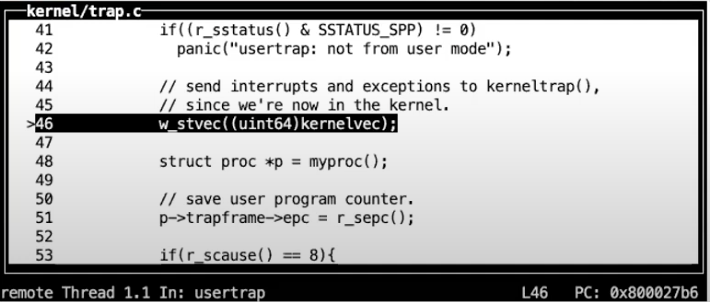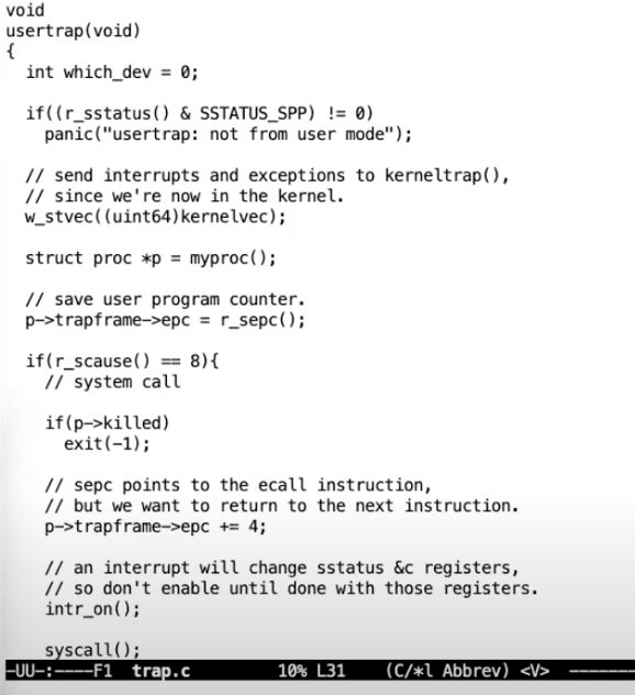 在内核中执行任何操作之前,usertrap中先将STVEC指向了kernelvec变量,这是内核空间trap处理代码的位置,而不是用户空间trap处理代码的位置。