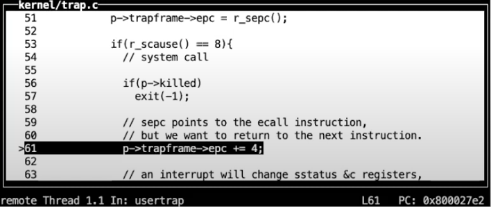 在RISC-V中,存储在SEPC寄存器中的程序计数器,是用户程序中触发trap的指令的地址。但是当我们恢复用户程序时,我们希望在下一条指令恢复,也就是ecall之后的一条指令。所以对于系统调用,我们对于保存的用户程序计数器加4,这样我们会在ecall的下一条指令恢复,而不是重新执行ecall指令。