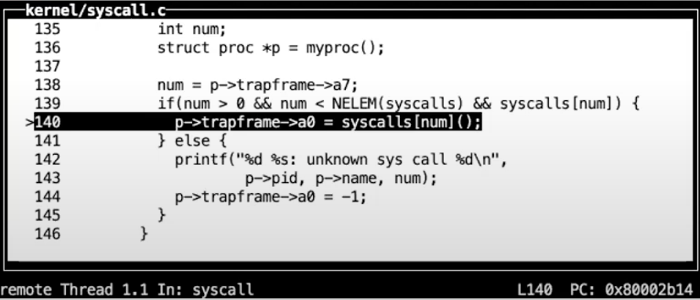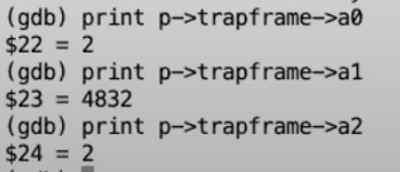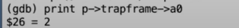 这里有件有趣的事情,系统调用需要找到它们的参数。你们还记得write函数的参数吗?分别是文件描述符2,写入数据缓存的指针,写入数据的长度2。syscall函数直接通过trapframe来获取这些参数,就像这里刚刚可以查看trapframe中的a7寄存器一样,我们可以查看a0寄存器,这是第一个参数,a1是第二个参数,a2是第三个参数。