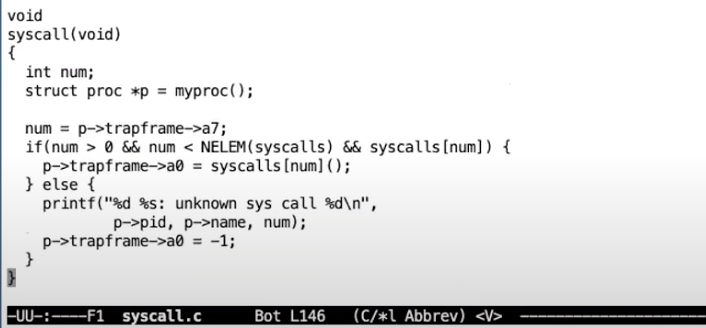 下一行代码中,我们会调用syscall函数。这个函数定义在syscall.c。