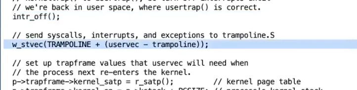 在下一行我们设置了STVEC寄存器指向trampoline代码,在那里最终会执行sret指令返回到用户空间。位于trampoline代码最后的sret指令会重新打开中断。这样,即使我们刚刚关闭了中断,当我们在执行用户代码时中断是打开的。