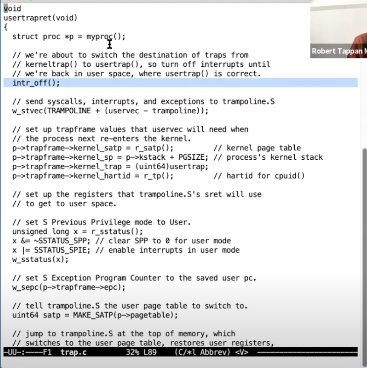 Robert教授:可以存储。trampoline代码没有像其他寄存器一样保存这个寄存器,但是我们非常欢迎大家修改XV6来保存它。如果你还记得的话(详见6.6),这个寄存器实际上是在C代码usertrap中保存的,而不是在汇编代码trampoline中保存的。我想不出理由这里哪种方式更好。用户寄存器(User Registers)必须在汇编代码中保存,因为任何需要经过编译器的语言,例如C语言,都不能修改任何用户寄存器。所以对于用户寄存器,必须要在进入C代码之前在汇编代码中保存好。但是对于SEPC寄存器(注,控制寄存器),我们可以早点保存或者晚点保存。
