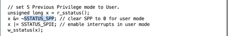 接下来我们要设置SSTATUS寄存器,这是一个控制寄存器。这个寄存器的SPP bit位控制了sret指令的行为,该bit为0表示下次执行sret的时候,我们想要返回user mode而不是supervisor mode。这个寄存器的SPIE bit位控制了,在执行完sret之后,是否打开中断。因为我们在返回到用户空间之后,我们的确希望打开中断,所以这里将SPIE bit位设置为1。修改完这些bit位之后,我们会把新的值写回到SSTATUS寄存器。