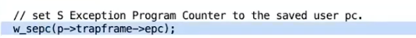 我们在trampoline代码的最后执行了sret指令。这条指令会将程序计数器设置成SEPC寄存器的值,所以现在我们将SEPC寄存器的值设置成之前保存的用户程序计数器的值。在不久之前,我们在usertrap函数中将用户程序计数器保存在trapframe中的epc字段。