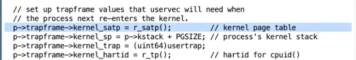 接下来的几行填入了trapframe的内容,这些内容对于执行trampoline代码非常有用。这里的代码就是:
