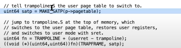 接下来,我们根据user page table地址生成相应的SATP值,这样我们在返回到用户空间的时候才能完成page table的切换。实际上,我们会在汇编代码trampoline中完成page table的切换,并且也只能在trampoline中完成切换,因为只有trampoline中代码是同时在用户和内核空间中映射。但是我们现在还没有在trampoline代码中,我们现在还在一个普通的C函数中,所以这里我们将page table指针准备好,并将这个指针作为第二个参数传递给汇编代码,这个参数会出现在a1寄存器。