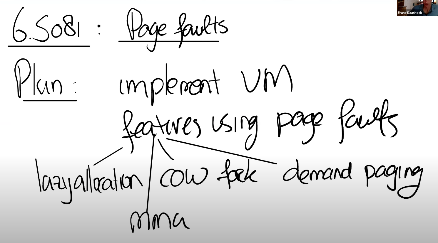在这节课,我们将会探讨在发生page fault时可以做的一些有趣的事情。这节课对于代码的讲解会比较少,相应的在设计层面会有更多的内容,毕竟我们也没有代码可以讲解(因为XV6中没有实现)。