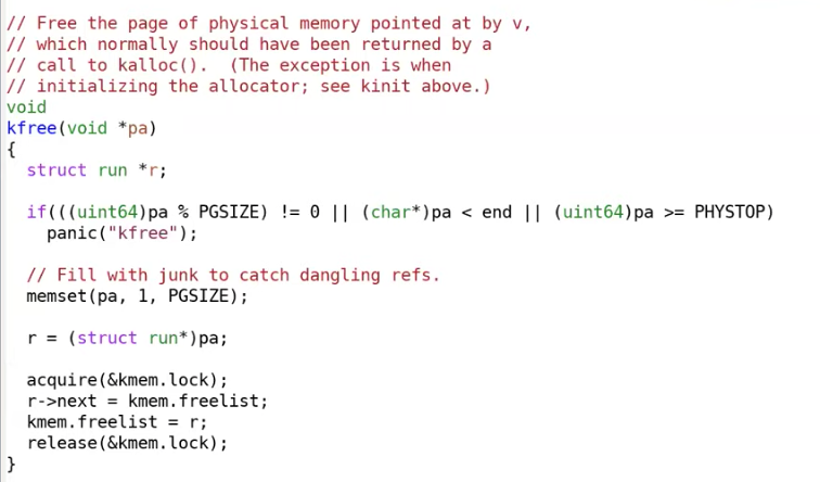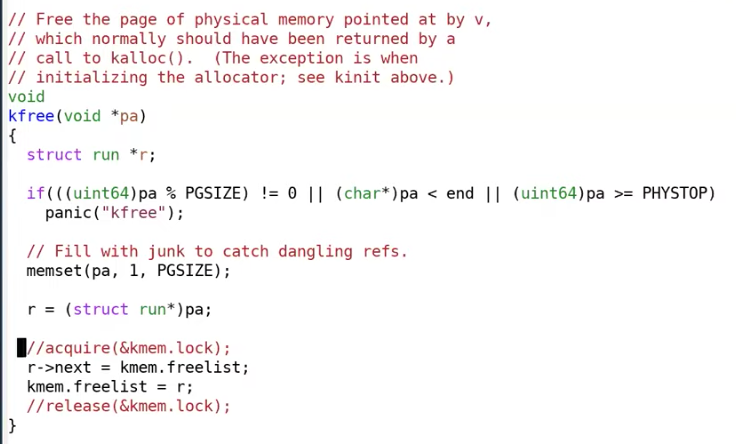 freelist是XV6中的一个非常简单的数据结构,它会将所有的可用的内存page保存于一个列表中。这样当kalloc函数需要一个内存page时,它可以从freelist中获取。从函数中可以看出,这里有一个锁kmem.lock,在加锁的区间内,代码更新了freelist。现在我们将锁的acquire和release注释上,这样原来在上锁区间内的代码就不再受锁保护,并且不再是原子执行的。