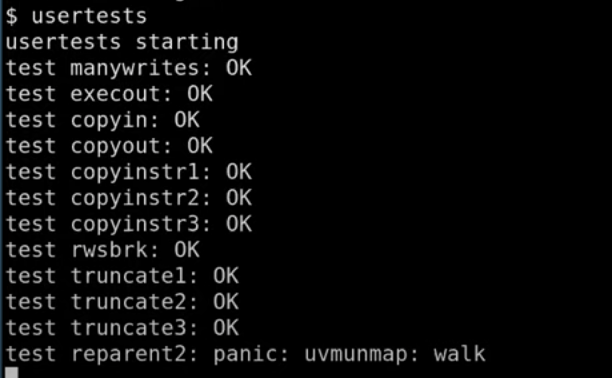 我们来看一下usertest运行的结果,可以看到已经有panic了。所以的确有一些race condition触发了panic。但是如前面的同学提到的,还有一些其他的race condition会导致丢失内存page,这种情况下,usertest运行并不会有问题。