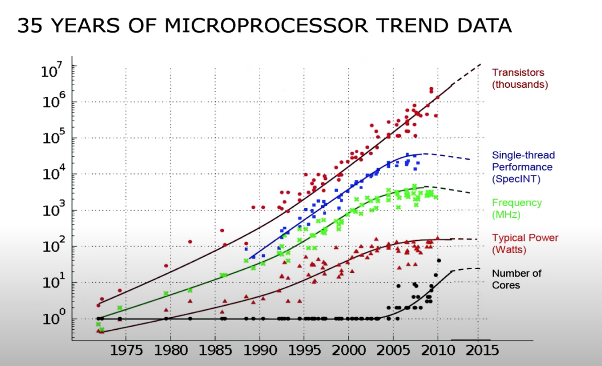 以上是一个大概的介绍,但是回到最开始,为什么应用程序一定要使用多个CPU核来提升性能呢?这个实际上与过去几十年技术的发展有关,下面这张非常经典的图可以解释为什么。