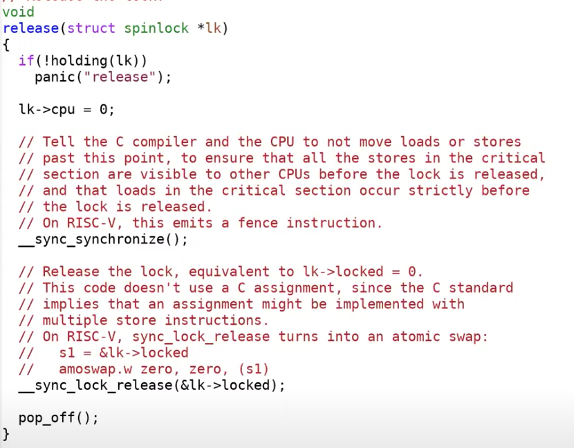 是的,可能有两个处理器或者两个CPU同时在向locked字段写入数据。这里的问题是,对于很多人包括我自己来说,经常会认为一个store指令是一个原子操作,但实际并不总是这样,这取决于具体的实现。例如,对于CPU内的缓存,每一个cache line的大小可能大于一个整数,那么store指令实际的过程将会是:首先会加载cache line,之后再更新cache line。所以对于store指令来说,里面包含了两个微指令。这样的话就有可能得到错误的结果。所以为了避免理解硬件实现的所有细节,例如整数操作不是原子的,或者向一个64bit的内存值写数据是不是原子的,我们直接使用一个RISC-V提供的确保原子性的指令来将locked字段写为0。