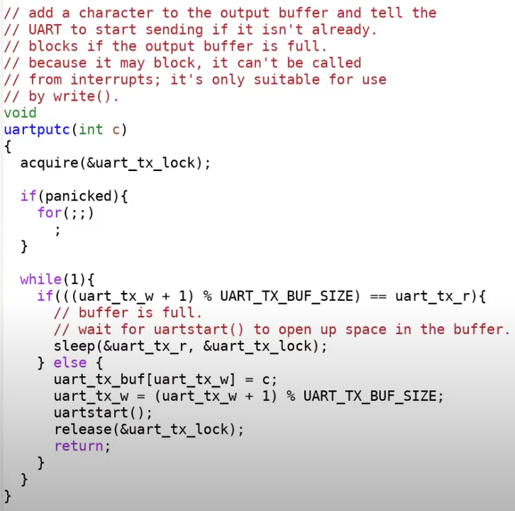 第二个细节是,在acquire函数的最开始,会先关闭中断。为什么会是这样呢?让我们回到uart.c中。我们先来假设acquire在一开始并没有关闭中断。在uartputc函数中,首先会acquire锁,如果不关闭中断会发生什么呢?