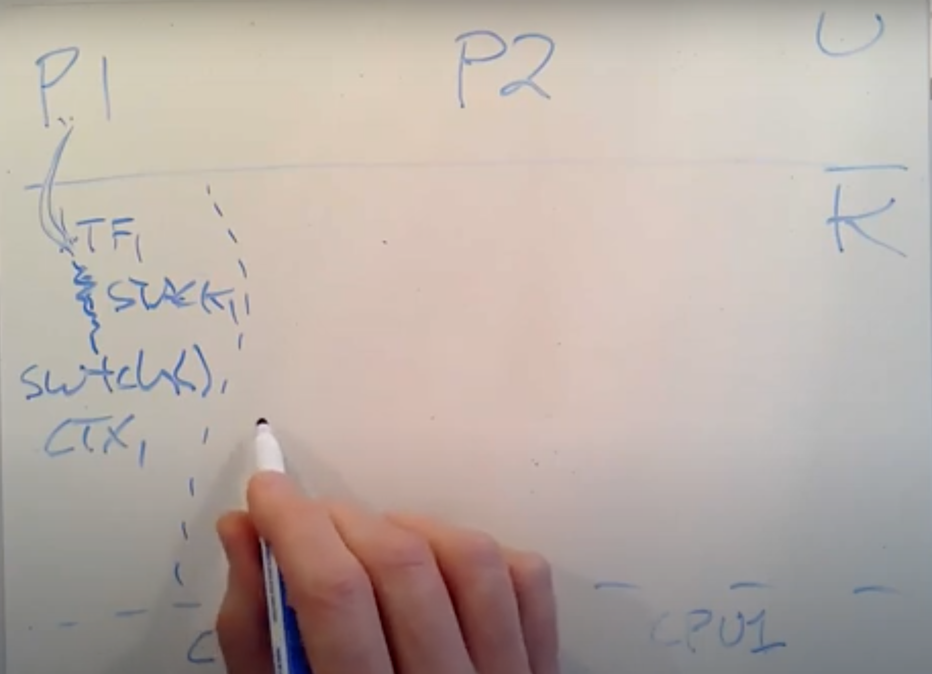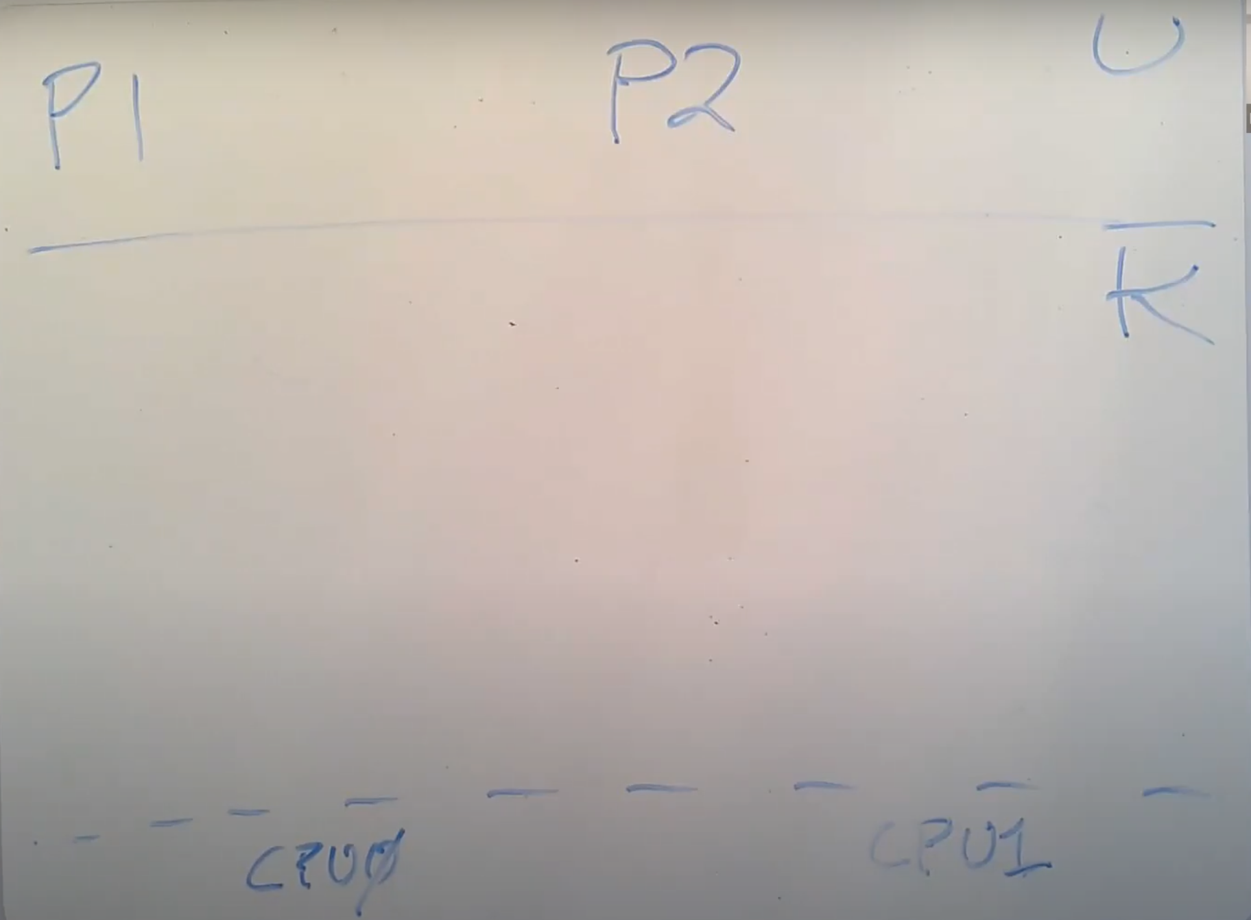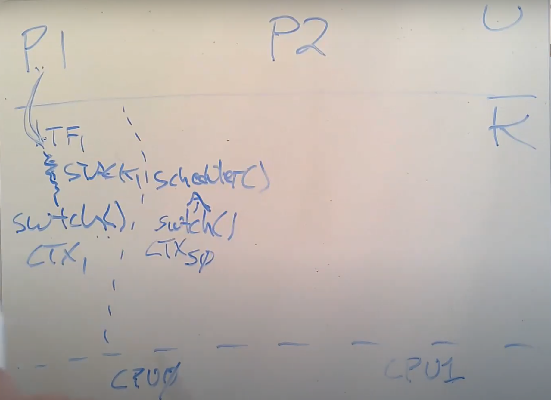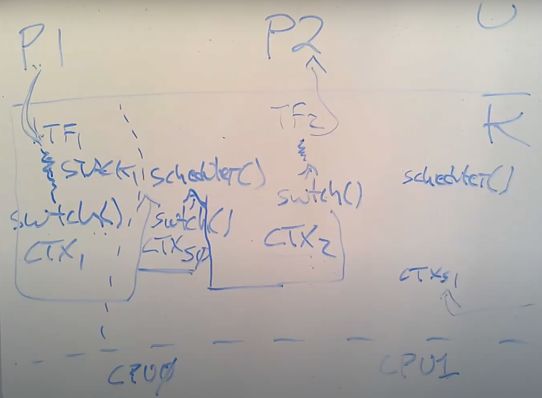 假设我们有进程P1正在运行,进程P2是RUNABLE当前并不在运行。假设在XV6中我们有2个CPU核,这意味着在硬件层面我们有CPU0和CPU1。