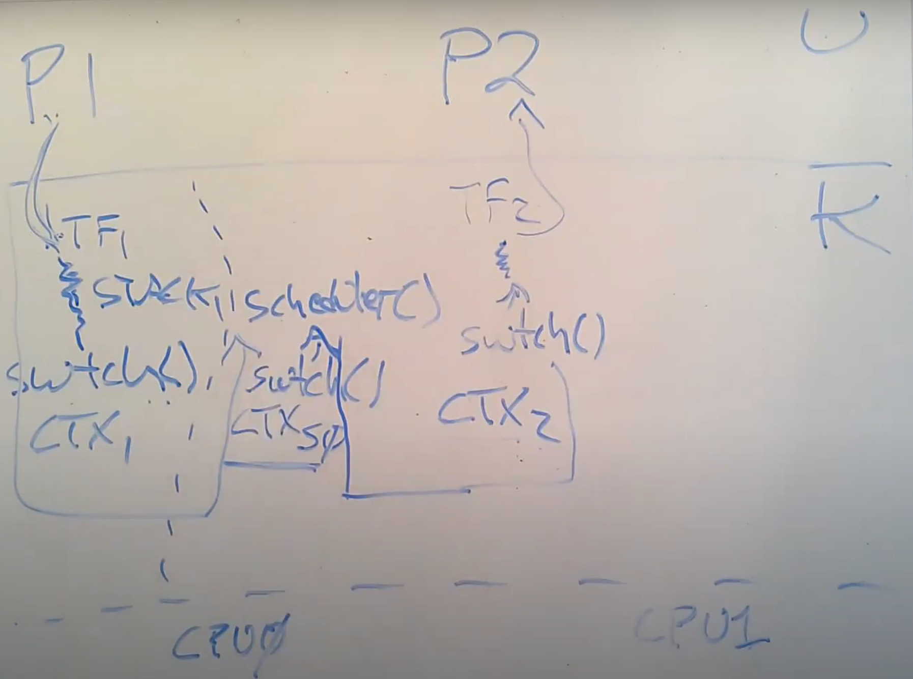这里有一个术语需要解释一下。当人们在说context switching,他们通常说的是从一个线程切换到另一个线程,因为在切换的过程中需要先保存前一个线程的寄存器,然后再恢复之前保存的后一个线程的寄存器,这些寄存器都是保存在context对象中。在有些时候,context switching也指从一个用户进程切换到另一个用户进程的完整过程。偶尔你也会看到context switching是指从用户空间和内核空间之间的切换。对于我们这节课来说,context switching主要是指一个内核线程和调度器线程之间的切换。