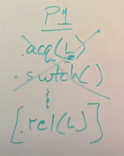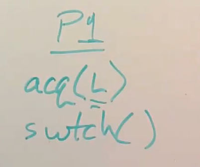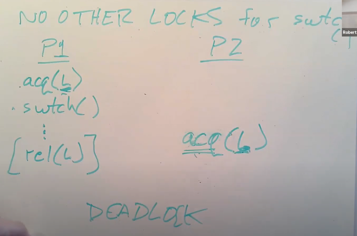 假设我们在一个只有一个CPU核的机器上,进程P1调用了switch函数将CPU控制转给了调度器线程,调度器线程发现还有一个进程P2的内核线程正在等待被运行,所以调度器线程会切换到运行进程P2。假设P2也想使用磁盘,UART或者console,它会对P1持有的锁调用acquire,这是对于同一个锁的第二个acquire调用。当然这个锁现在已经被P1持有了,所以这里的acquire并不能获取锁。假设这里是spinlock,那么进程P2会在一个循环里不停的“旋转”并等待锁被释放。但是很明显进程P2的acquire不会返回,所以即使进程P2稍后愿意出让CPU,P2也没机会这么做。之所以没机会是因为P2对于锁的acquire调用在直到锁释放之前都不会返回,而唯一锁能被释放的方式就是进程P1恢复执行并在稍后release锁,但是这一步又还没有发生,因为进程P1通过调用switch函数切换到了P2,而P2又在不停的“旋转”并等待锁被释放。这是一种死锁,它会导致系统停止运行。
