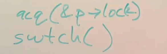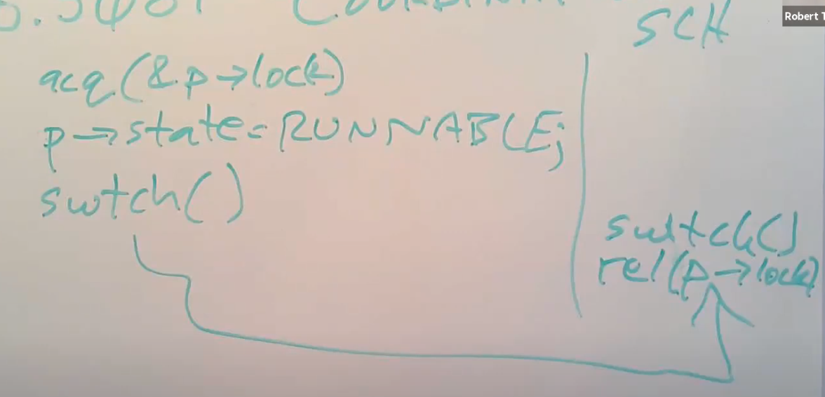 首先是上节课的回顾。在XV6中,任何时候调用switch函数都会从一个线程切换到另一个线程,通常是在用户进程的内核线程和调度器线程之间切换。在调用switch函数之前,总是会先获取线程对应的用户进程的锁。所以过程是这样,一个进程先获取自己的锁,然后调用switch函数切换到调度器线程,调度器线程再释放进程锁。