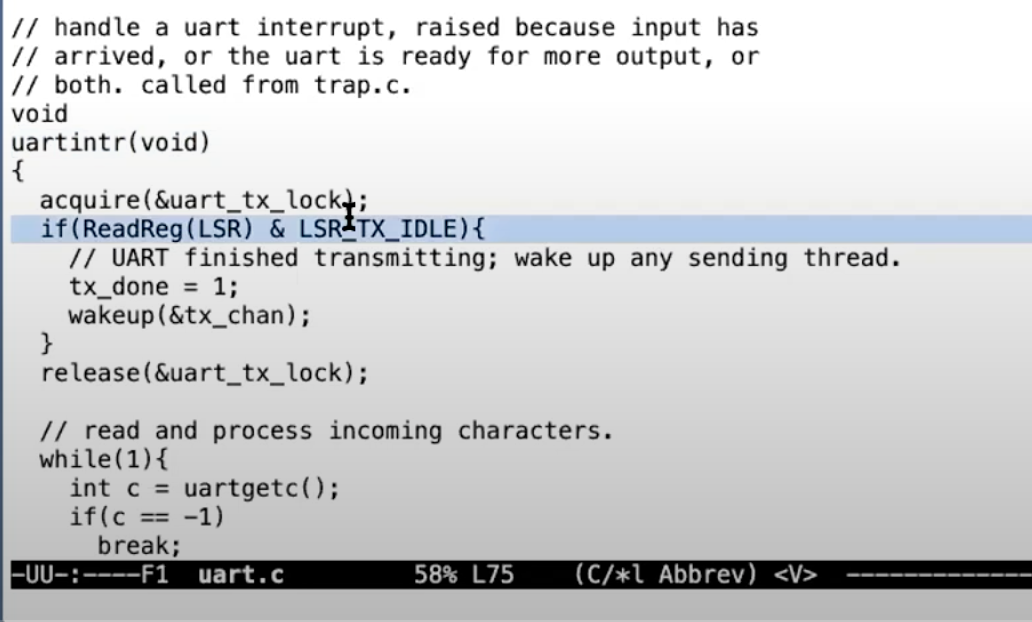 介绍完背景了,接下来我们看一下XV6的代码。为了准备这节课,我重写了UART的驱动代码,XV6通过这里的驱动代码从console中读写字符。