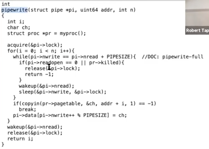 pipewrite会向pipe的缓存写数据,并最后在piperead所等待的sleep channel上调用wakeup。而我们想要避免这样的风险:在piperead函数检查发现没有字节可以读取,到piperead函数调用sleep函数之间,另一个CPU调用了pipewrite函数。因为这样的话,另一个CPU会向pipe写入数据并在piperead进程进入SLEEPING之前调用wakeup,进而产生一次lost wakeup。