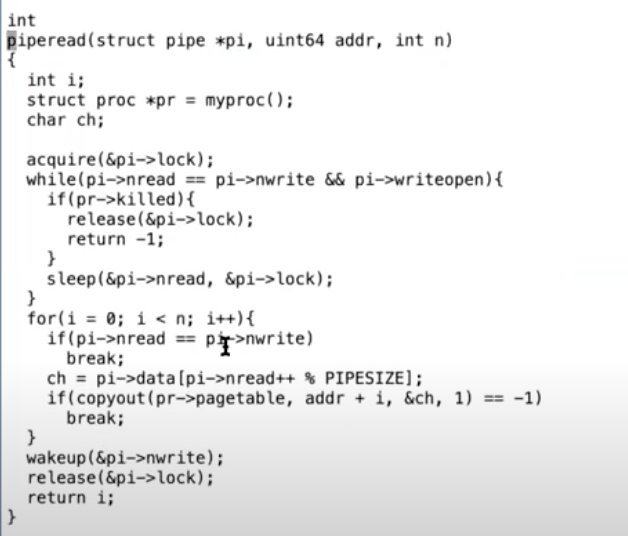 这里有很多无关的代码可以忽略。当read系统调用最终调用到piperead函数时,pi->lock会用来保护pipe,这就是sleep函数对应的condition lock。piperead需要等待的condition是pipe中有数据,而这个condition就是pi->nwrite大于pi->nread,也就是写入pipe的字节数大于被读取的字节数。如果这个condition不满足,那么piperead会调用sleep函数,并等待condition发生。同时piperead会将condition lock也就是pi->lock作为参数传递给sleep函数,以确保不会发生lost wakeup。