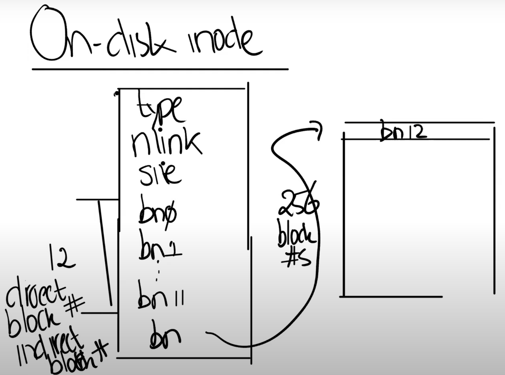 - 之后还有一个indirect block number,它对应了磁盘上一个block,这个block包含了256个block number,这256个block number包含了文件的数据。所以inode中block number 0到block number 11都是direct block number,而block number 12保存的indirect block number指向了另一个block。