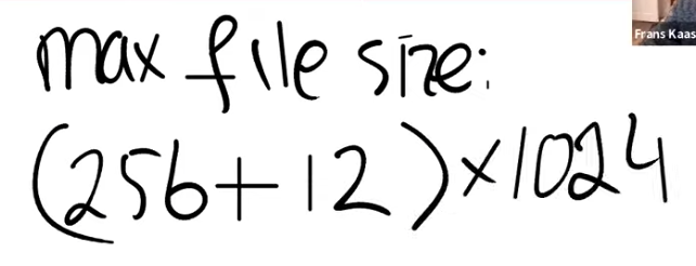 Frans教授:因为每个编号是4个字节。1024/4 = 256。这又带出了一个问题,如果block编号只是4个字节,磁盘最大能有多大?是的,2的32次方(注,4TB)。有些磁盘比这个数字要大,所以通常人们会使用比32bit更长的数字来表示block编号。