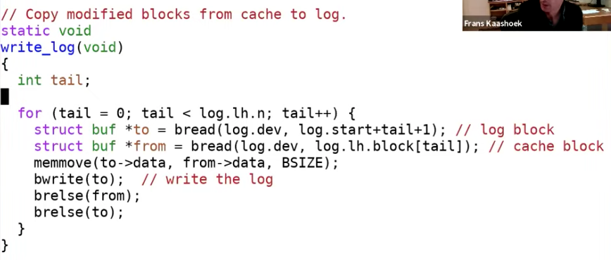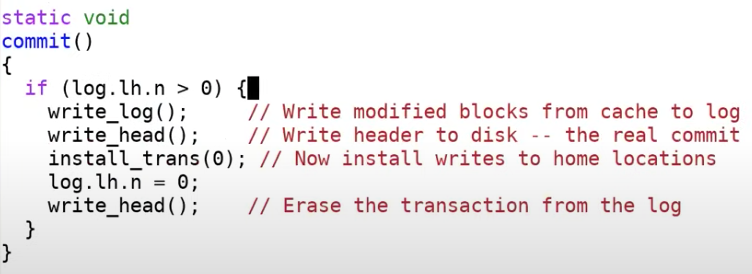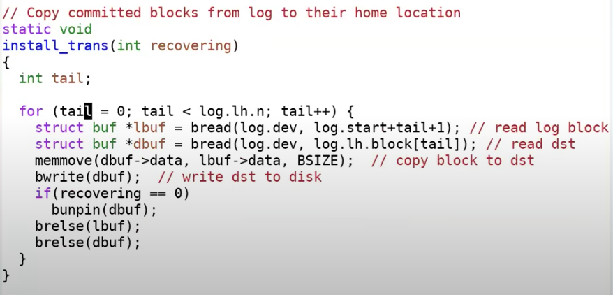 这时header会写入到磁盘中,当重启恢复相应的文件系统操作会被恢复。在恢复过程的某个时间点,恢复程序可以读到log header并发现比如说有5个log还没有install,恢复程序可以将这5个log拷贝到实际的位置。所以这里的bwrite就是实际的commit point。在commit point之前,transaction并没有发生,在commit point之后,只要恢复程序正确运行,transaction必然可以完成。
