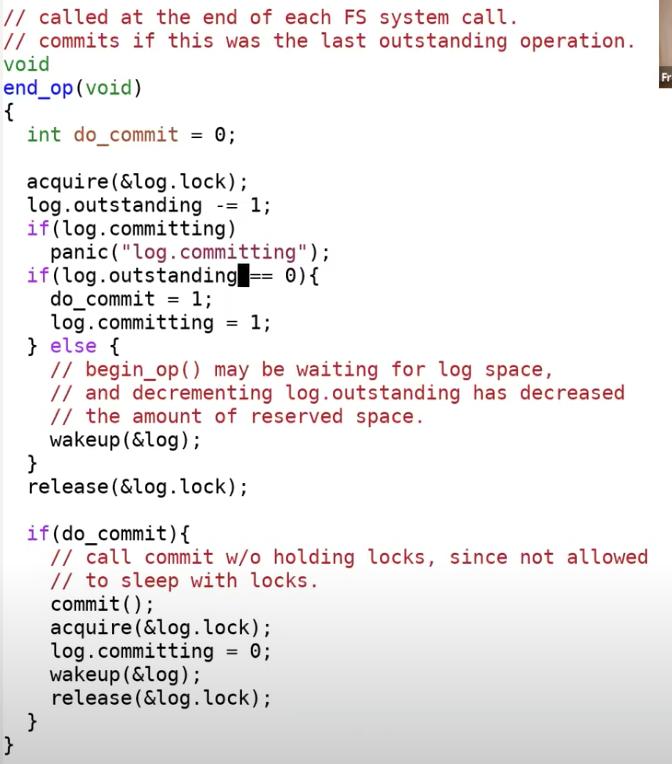 接下来我们看看位于log.c中的end_op函数中会发生什么?