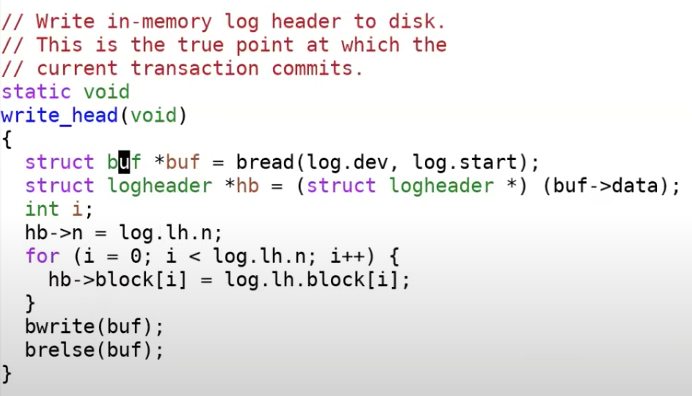 函数中依次遍历log中记录的block,并写入到log中。它首先读出log block,将cache中的block拷贝到log block,最后再将log block写回到磁盘中。这样可以确保需要写入的block都记录在log中。但是在这个位置,我们还没有commit,现在我们只是将block存放在了log中。如果我们在这个位置也就是在write_head之前crash了,那么最终的表现就像是transaction从来没有发生过。