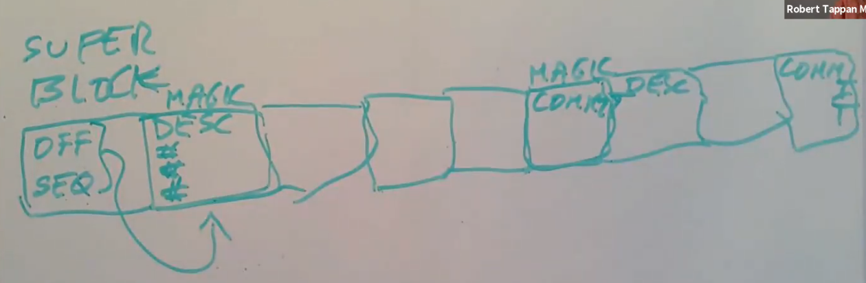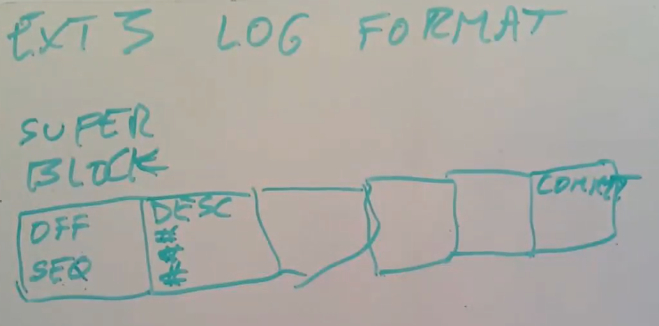 因为log中可能有多个transaction,commit block之后可能会跟着下一个transaction的descriptor block,data block和commit block。所以log可能会很长并包含多个transaction。我们可以认为super block中的起始位置和序列号属于最早的,排名最靠前的,并且是有效的transaction。