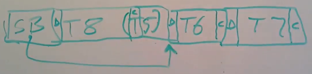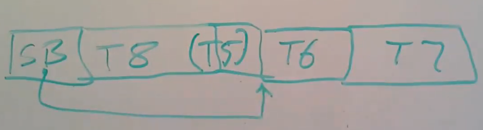 crash或许会打断任何在进行中的transaction,或许transaction正在commit,或许transaction正在向文件系统写block。让我重新画一个例子,我们在log中有一个super block,之后是transaction T6,T7,T8,在T8之后是一个已近被释放了log空间的T5,假设T8已经用了T5的一部分空间。并且现在super block指向的是T6的起始位置,因为T6是最早的transaction。