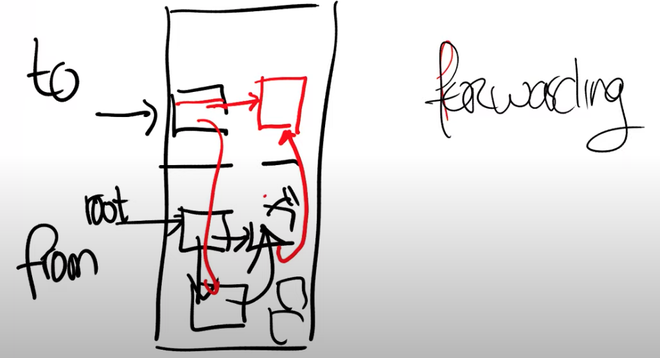 在之后的过程中,我们需要记住这个对象已经被拷贝过了。所以,我们还会存储一些额外的信息来记住相应的对象已经保存在了to空间,这里会在from空间保留一个forwarding指针。这里将对象从from空间拷贝到to空间的过程称为forward。