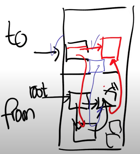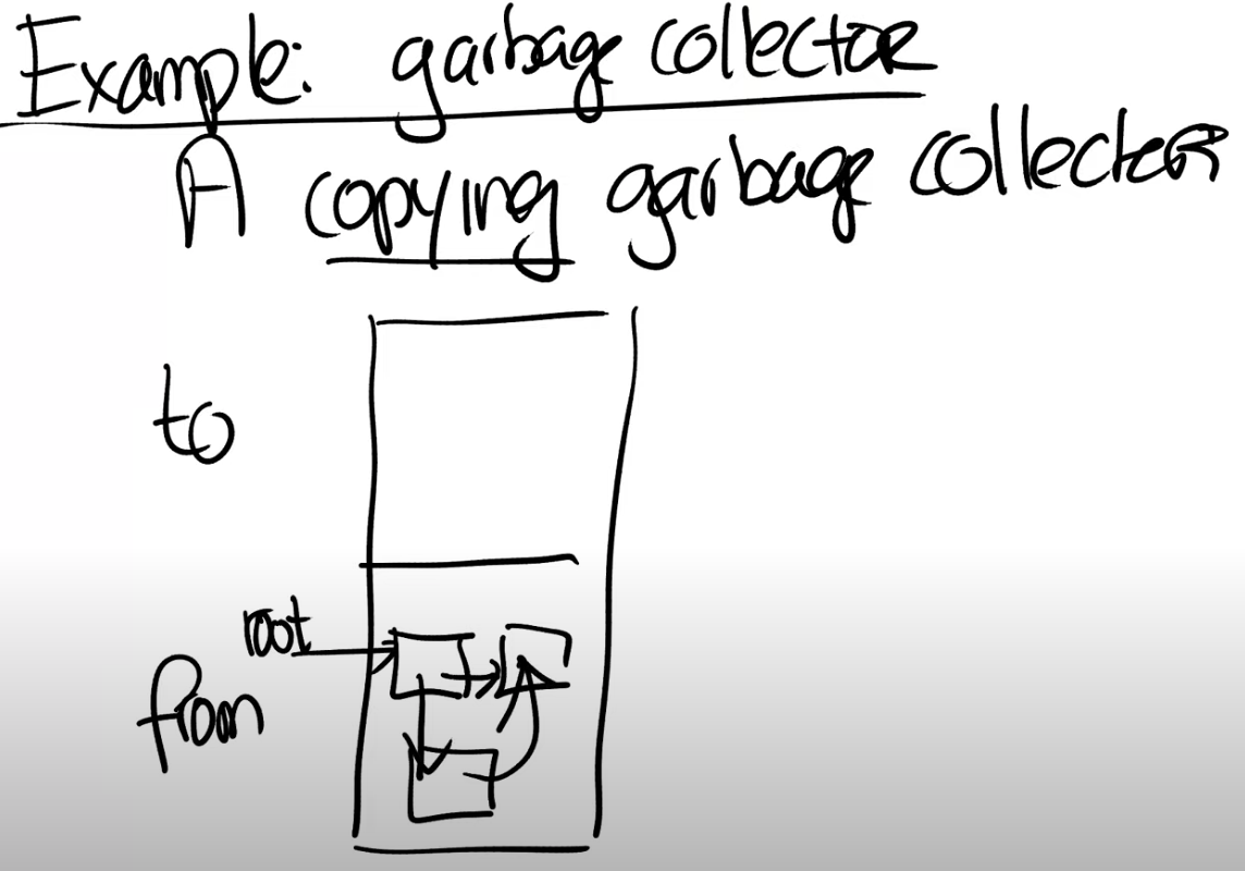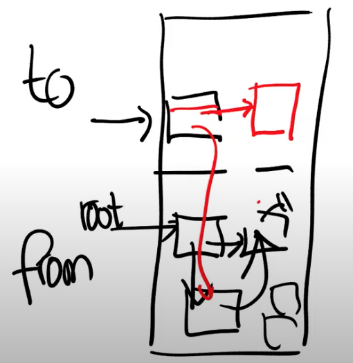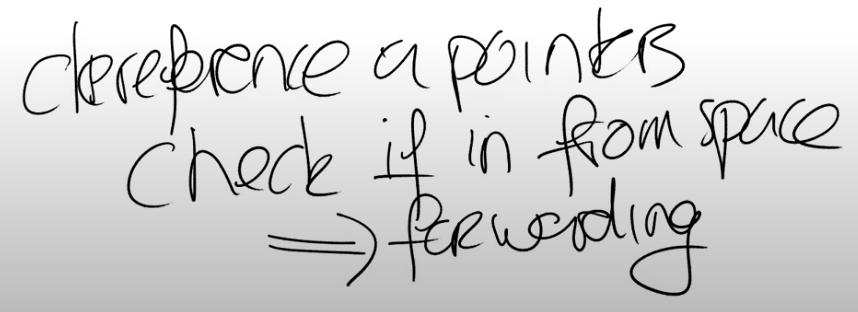 当然应用程序也会使用这里对象所指向的指针。举个例子,现在当根节点需要读出其指向的一个对象时,这个对象仍然在from空间。这是危险的,因为我们不应该跟踪from空间的指针(注,换言之GC时的指针跟踪都应该只在同一个空间中完成)。所以每次获取一个指针指向的对象时(dereference),你需要检查对象是否在在from空间,如果是的话,将其从from空间forward到to空间。所以应用程序允许使用指针,但是编译器需要对每个指针的访问都包上一层检查,这样我们就可以保证在to空间的任何指针指向的是位于to空间的对象。我们需要确保这一点,因为在最后当GC完成了所有对象的跟踪之后,我们会清空from部分并重用这部分内存。