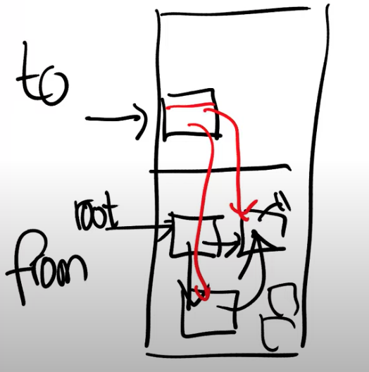 之后,GC会扫描根节点对象。因为程序的运行时知道对象的类型是什么,当然也就知道对象中的指针。接下来GC会将根节点对象中指针指向的对象也拷贝到to空间,很明显这些也是还在使用中的对象。当一个对象被拷贝到to空间时,根节点中的指针会被更新到指向拷贝到了to空间的对象。