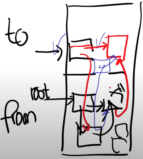 Copying GC的基本思想是将仍然在使用的对象拷贝到to空间去,具体的流程是从根节点开始拷贝。每一个应用程序都会在一系列的寄存器或者位于stack上的变量中保存所有对象的根节点指针,通常来说会存在多个根节点,但是为了说明的简单,我们假设只有一个根节点。拷贝的流程会从根节点开始向下跟踪,所以最开始将根节点拷贝到了to空间,但是现在根节点中的指针还是指向着之前的对象。