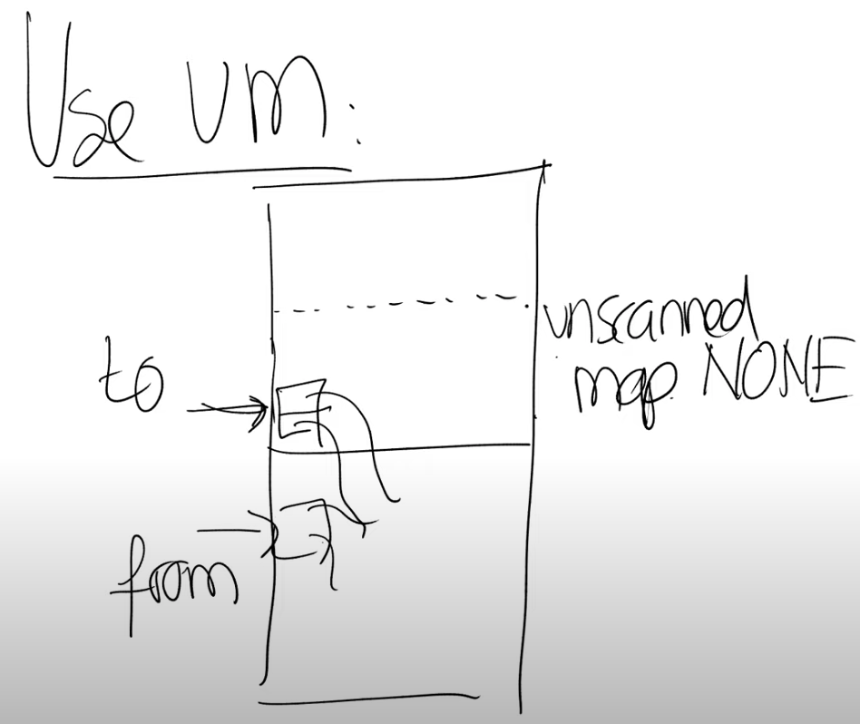 这里的技巧是使用map2(注,详见17.1)。这里我们会将同一个物理内存映射两次,第一次是我们之前介绍的方式,也就是为应用程序进行映射,第二次专门为GC映射。在GC的视角中,我们仍然有from和to空间。在to空间的unscanned区域中,Page具有读写权限。
