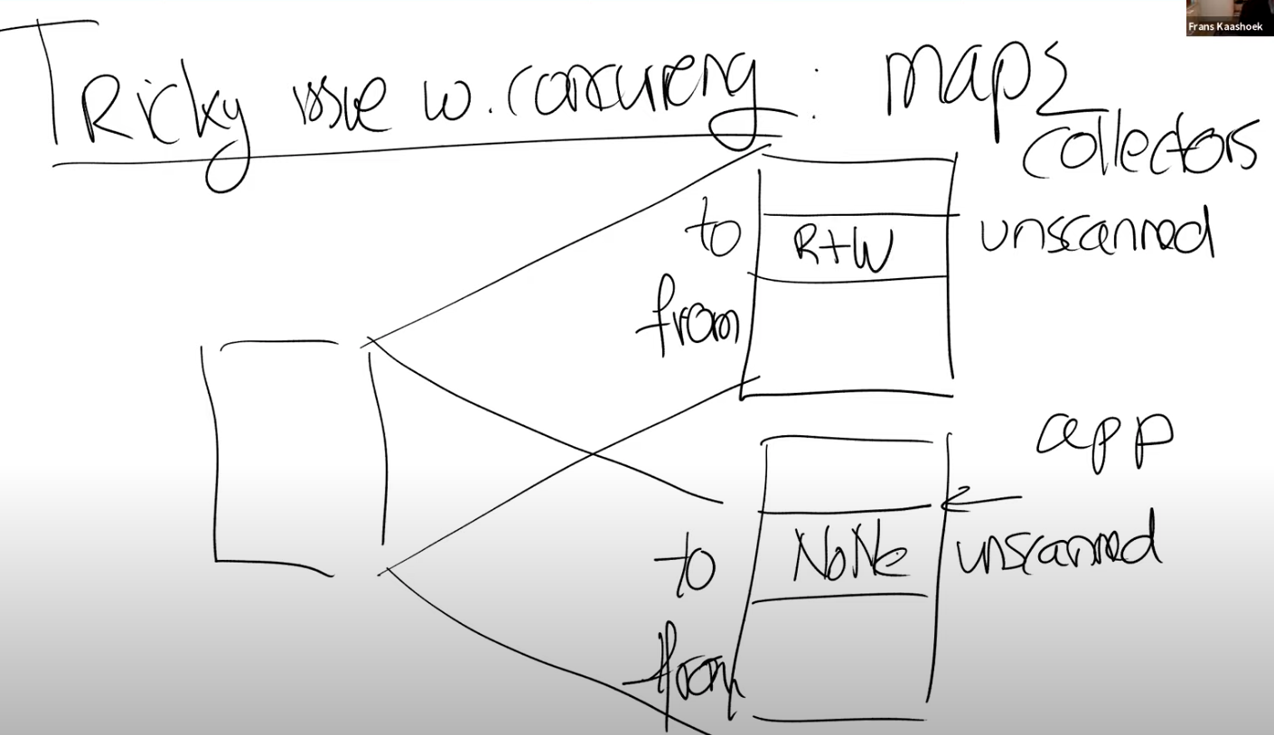 论文中提到使用虚拟内存的另一个好处是,它简化了GC的并发。GC现在可以遍历未被扫描的内存Page,并且一次扫描一个Page,同时可以确保应用程序不能访问这个内存Page,因为对于应用程序来说,未被扫描的内存Page权限为None。虚拟内存硬件引入了这种显式的同步机制,或者说对于抢占的保护。