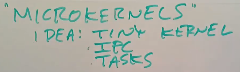 这里需要注意的关键信息是,在内核中唯一需要做的是支持进程/任务/线程,以及支持IPC来作为消息的传递途径,除此之外,内核不用做任何事情。内核中没有任何文件系统,没有任何设备驱动,没有网络协议栈,所有这些东西以普通用户进程在运行。所以这提供给你一种非常小的内核,以及相对少的代码去优化,你可以优化IPC,除此之外也没有别的东西了。上图就是我们在这节课剩下的时间要讨论的内容。