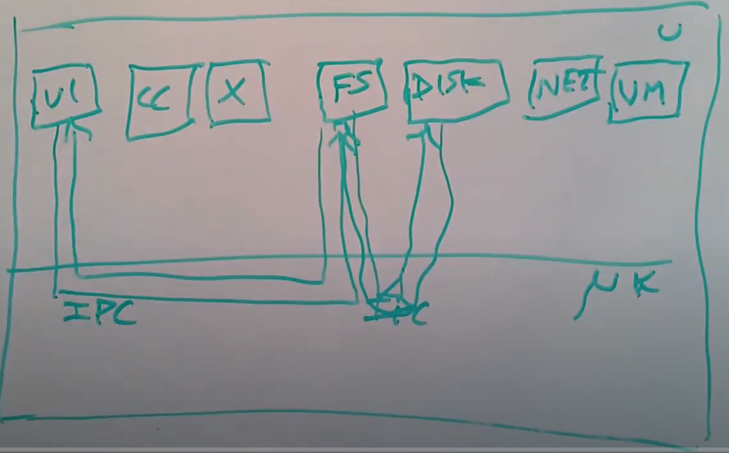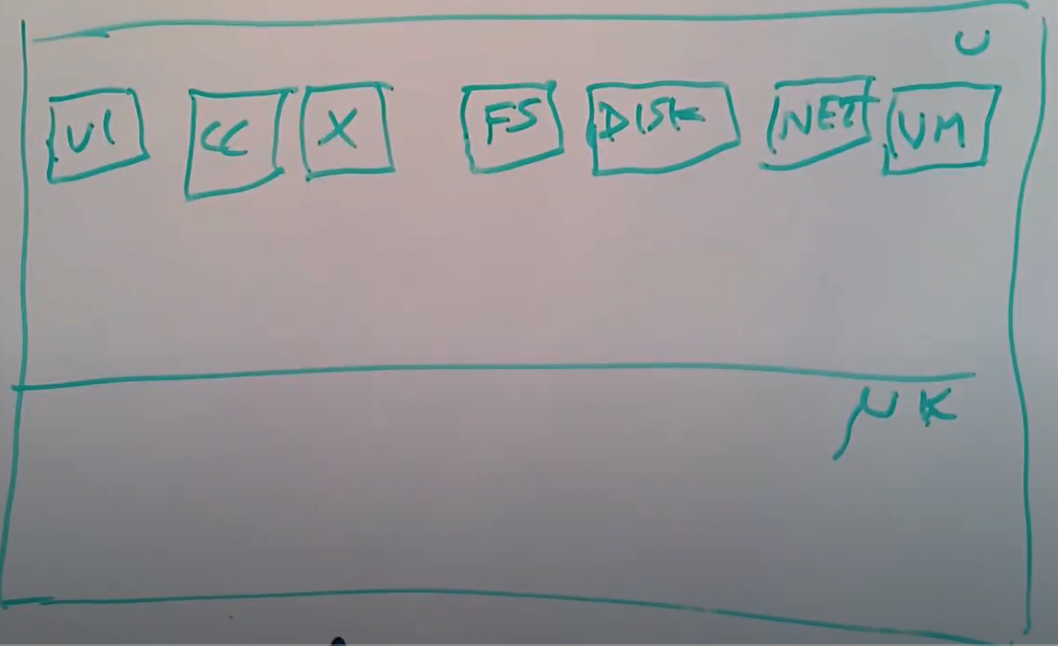 画个图来展示一下,整个计算机还是分为两层,下面是kernel,上面是用户空间。在用户空间或许还是会有各种各样常见的程序,例如VI,CC,桌面系统。除此之外,在用户空间还会有文件系统以及知道如何与磁盘交互的磁盘驱动,或许我们还会有一个知道如何进行TCP通信的网络协议栈,或许还有一个可以实现酷炫虚拟内存技巧的虚拟内存系统。