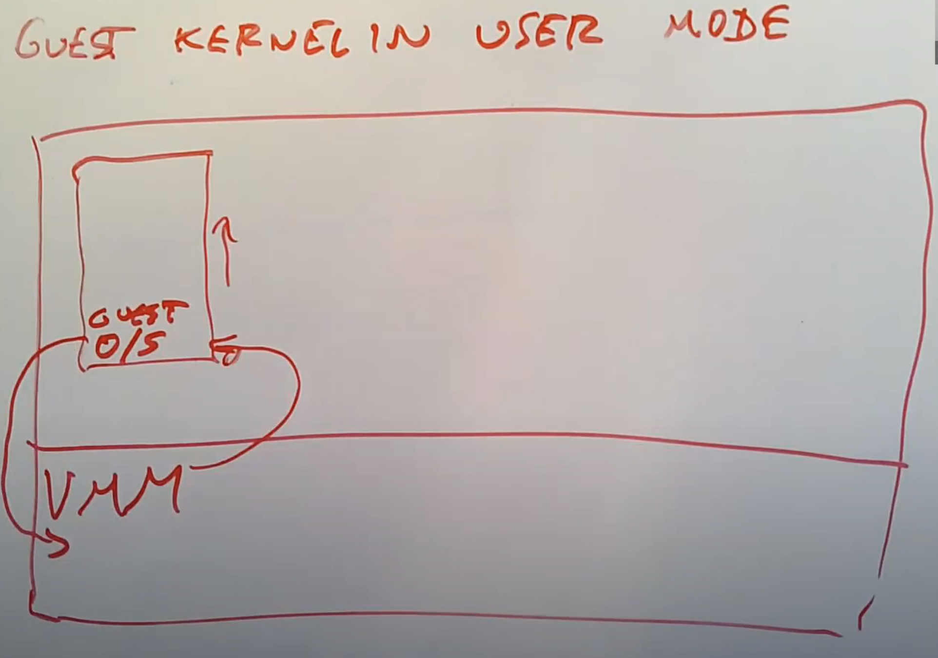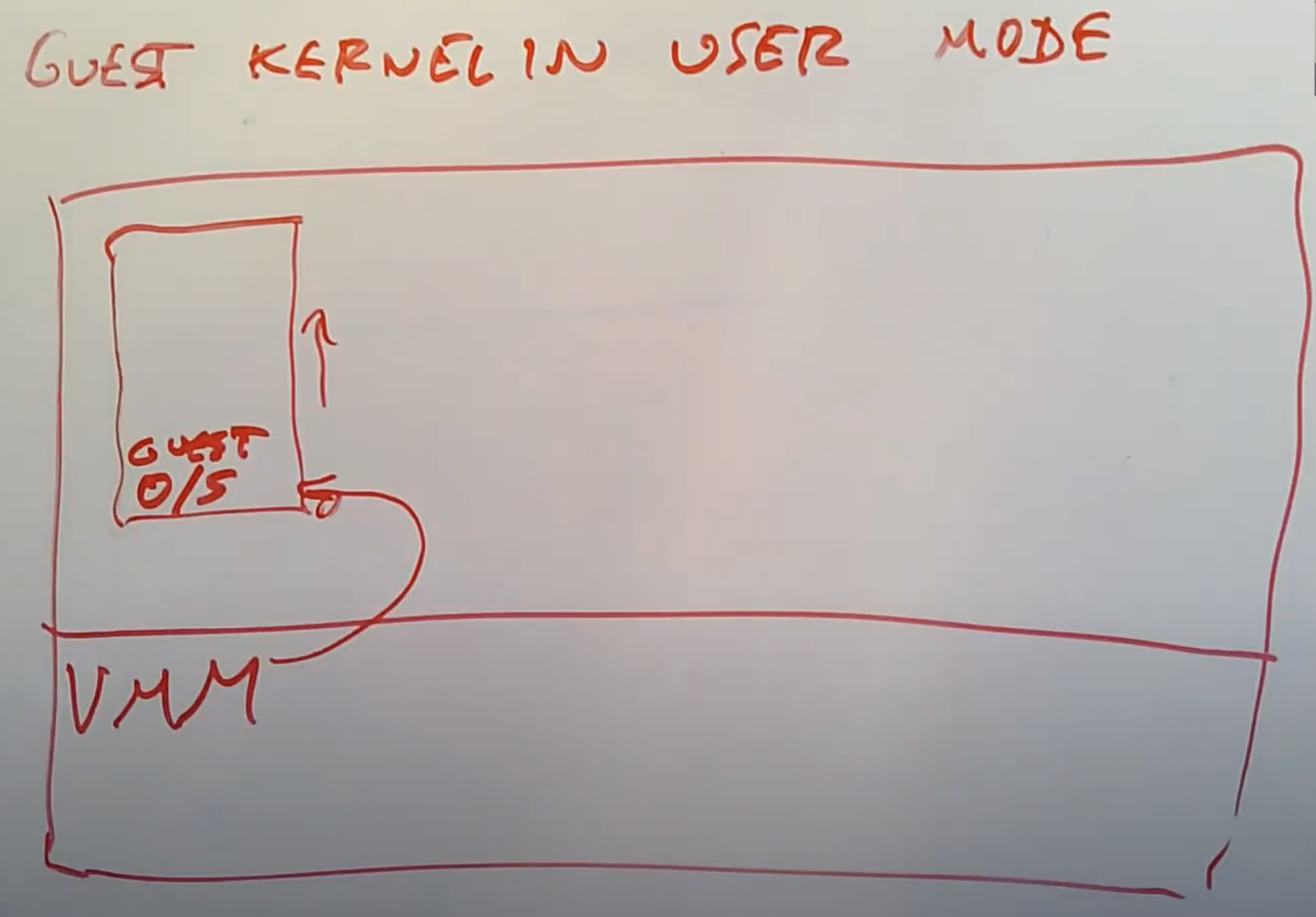 Robert教授:我这里假设VMM运行在Supervisor mode。所以在这里的图中,VMM就是宿主机的kernel。这里我们不是启动类似Linux的操作系统,而是启动VMM(注,类似VMware的ESXi)。VMM以privileged权限运行,并拥有硬件的完整控制权限,这样我们就可以在VMM里面设置各种硬件寄存器。有一些VMM就是这么运行的,你在硬件上启动它们,并且只有VMM运行在Supervisor mode。实际上还有很多很多其他的虚拟机方案,比如说在硬件上启动Linux,之后要么Linux自带一个VMM,要么通过可加载的内核模块将VMM加载至Linux内核中,这样VMM可以在Linux内核中以Supervisor mode运行。今天我们要讨论的论文就是采用后者。