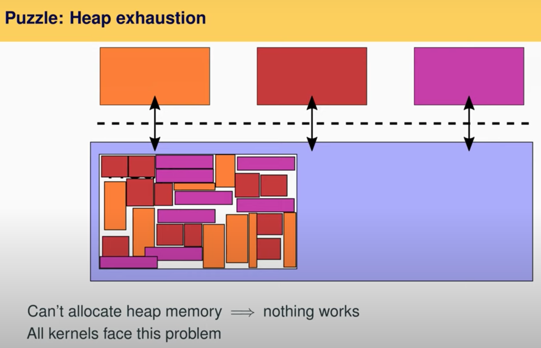 在某个时间点,heap会被填满,这时没有额外的空间可以用来分配一个新的对象。如果这时应用程序需要打开一个新的文件描述符,或者调用了fork使得内核想要在heap中分配一个新的proc结构体,heap中没有了空间。这时你该怎么办呢?这是一个不太常见的常见问题,但是如果你使劲用你的电脑,你或许会遇到所有内存都被使用了的情况,你的heap满了,并且没有进程调用free,因为它们都还在运行且想分配到更多的内存。所有的内核都会遇到这个问题,不管是C内核也好,Biscuit也好,任何内核都需要解决这个问题。