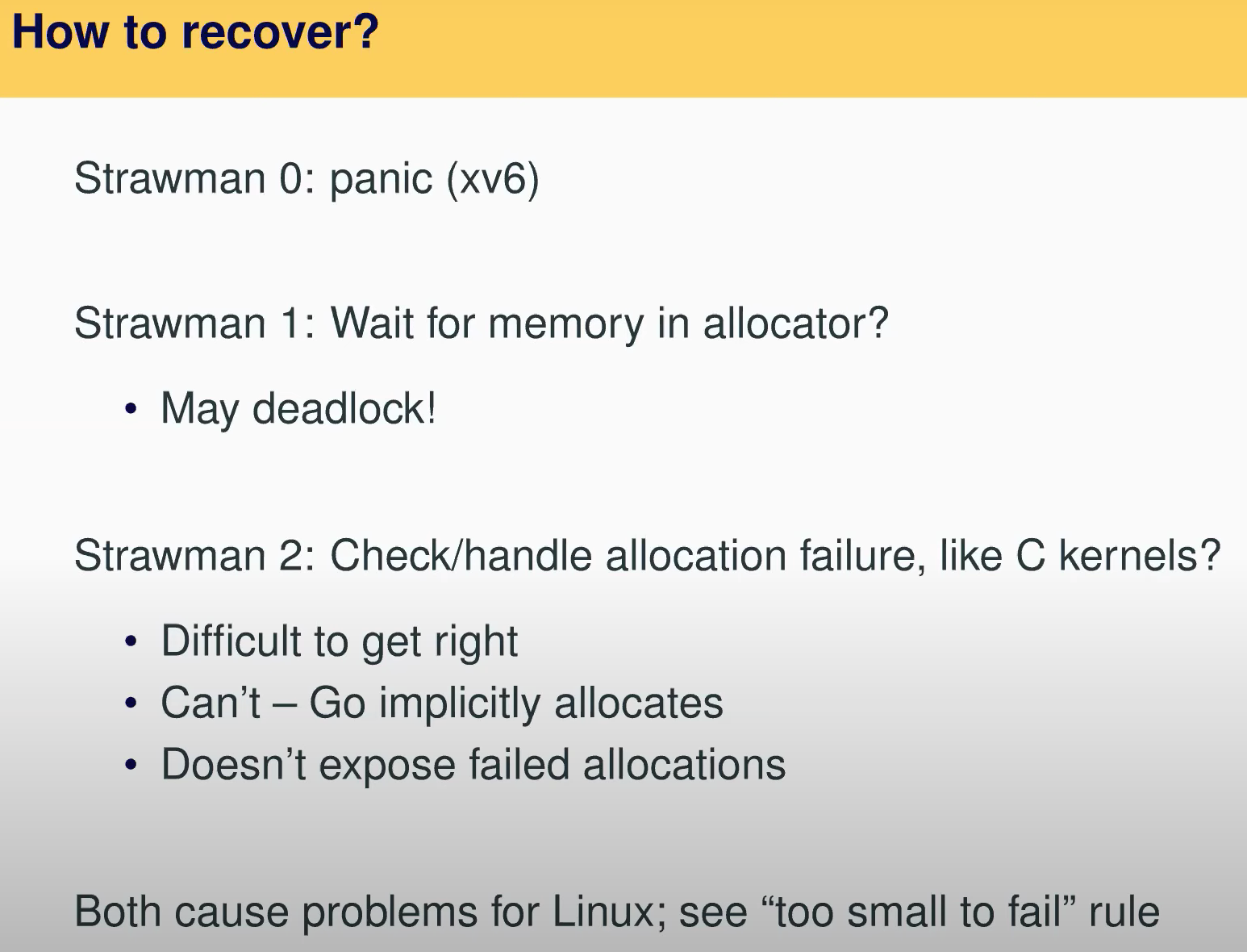- 下一个strawman方法是,如果没有内存了就返回空指针,你检查如果是空指针就直接失败,这被称为bail out。但是bail out并不是那么直观,进程或许已经申请了一些内存,那么你需要删除它们,你或许做了一部分磁盘操作,比如说你在一个多步的文件系统操作中间,你只做了其中的一部分,你需要回退。所以实际中非常难做对。